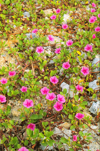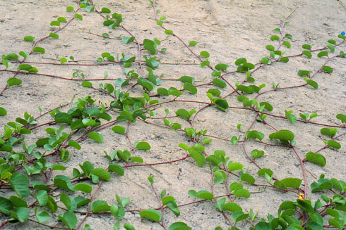 | 記事 | 夏季的海濱儘管豔陽高照,但是仍然有不少嬌美的花兒綻放其間,其中最讓人激賞的當屬海濱花后—-馬鞍藤,它是因為葉形如馬鞍而得名;細看馬鞍藤的花,呈完整的漏斗形,和大家所熟知的牽牛花幾乎是一模一樣;嗯!它可是牽牛花的兄弟,不過,不同的是,因為長期生長在海邊的緣故,它的莖不再攀緣在其他的物體之上,而是在沙灘上匍匐蔓生,向四面八方拓展地盤,節節生根,無懼於烈日強風。 |
