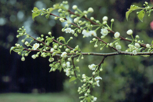 | 性狀描述 | 落葉性灌木,分枝甚多,小枝光滑無毛;葉薄紙質,卵形,鋸齒緣;春季開小白花,數朵簇生,開於葉腋,花梗纖細,基部有苞;萼片4-5裂,花瓣4-5枚;雄蕊與花瓣同數,柱頭圓形(無花柱);核果橢圓形,具有縱稜。 |