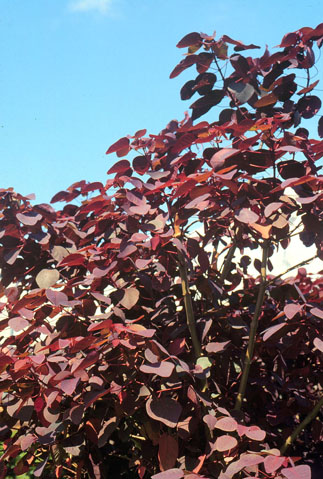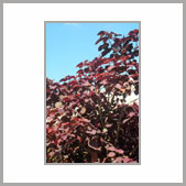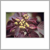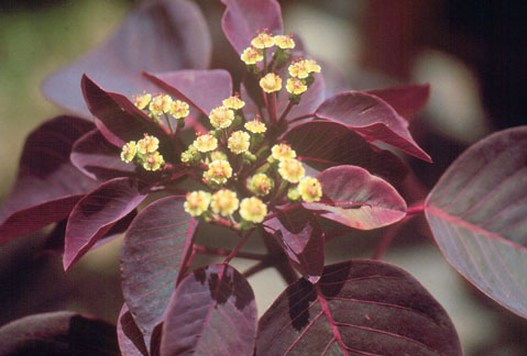 | 性狀描述 | 常綠灌木,株高2-3公尺,樹皮灰白,分枝多,嫩莖與葉片均呈紅褐色或暗紫紅色,葉有長柄,葉身卵形或廣卵形,長約4-6公分,寬約3-4公分。四季開花,花頂生,淡黃色,大戟花序有5裂片,聚繖狀排列,花細小,蒴果球形,但結果率甚低,花與果均缺乏觀賞價值。 |