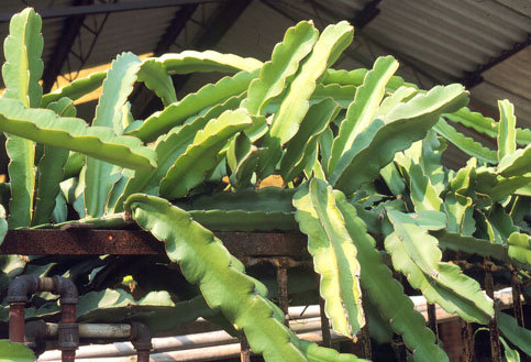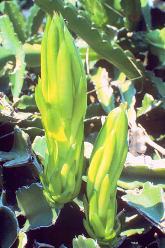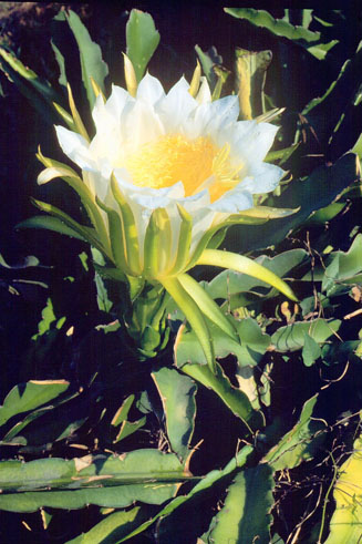 | 性狀描述 | 常綠肉質性攀緣植物,蔓莖甚長,具3條波狀薄稜,稜上凹陷處著生1-3短銳刺;夏季夜晚至凌晨開花,花朵略呈漏斗狀,具多數厚肉質之鱗片狀苞片,花萼黃綠色,線形,花開時向外反卷,花瓣白色,直立狀長橢圓形,花長約30公分,雄蕊多數,雌蕊柱頭具多數裂片;果實長橢圓形,長約12-15公分,成熟時紅色。 |